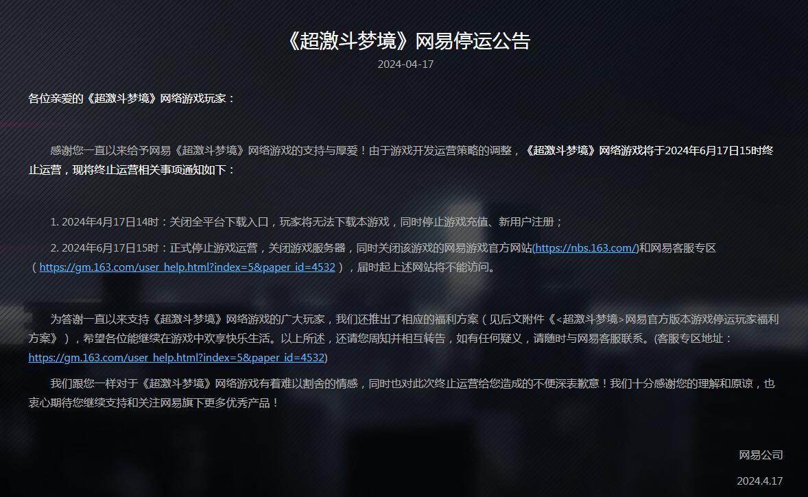近日網易雷火研發的動作遊戲《超激鬥夢境》宣佈,因爲遊戲開發運營策略的調整,遊戲將於2024年6月17日停運。