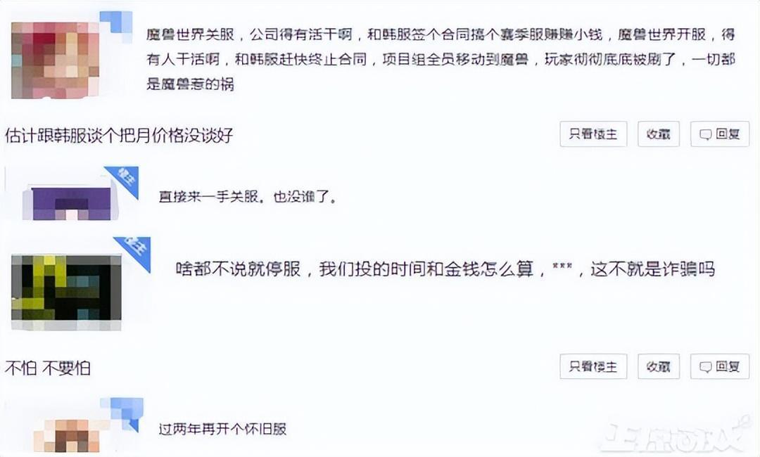 對於遊戲的停運,有網友分析說,此前魔獸關服,所以遊戲和韓服合作搞賽季,讓公司有活幹,如今魔獸開服了,就和韓服結束合作,人員轉移到魔獸那邊去,這是把玩家給耍了,一切都是魔獸惹的禍。還有網友覺得是韓方的問題,說是估計和韓服沒談好價格,所以直接關服了。
