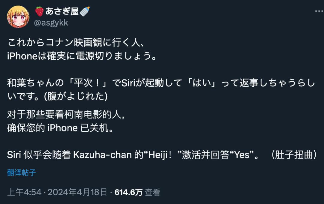日語裏的「平次!」跟「嘿 siri!」讀起來很像。和葉醬大喊「平次!」的時候,蘋果的智能助手Siri都會啓動,然後回答「哎,我在」。