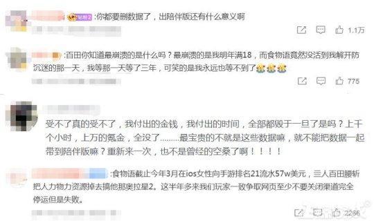 作爲運營長達四年的人氣遊戲,《食物語》停服在玩家社羣引起了不小的震動。當晚“食物語停運”和“百田”等詞條衝上了熱搜,大量玩家表達了對遊戲的不捨和憤懣。