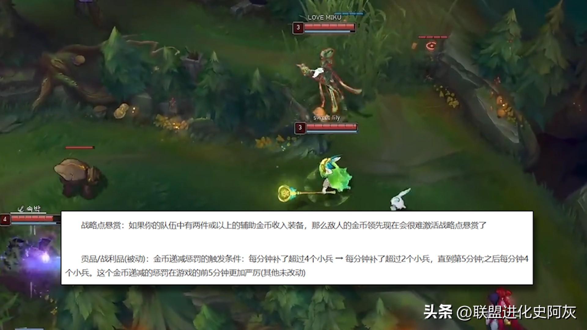 這一番操作幾乎把單人線出工資裝理財這條路給堵死了,但有些玩家是真特麼鬼才,在這種嚴防死守之下,還能突破成功,S12賽季聯盟新增了戰略點懸賞,一開始這玩意的觸發條件很玄乎,單線對位經濟差大就能觸發,並且持續時間賊長,經常是經濟翻了賞金還在,於是便有玩家開創了“擺爛流”,選個軟輔帶上懲戒,跟打野去入侵野區,上路直接放空給對面,鍍層一掉戰略點有了,然後野爹帶着先鋒恰飽飽,設計師這會估計人都麻了,也懶得想怎麼平衡,索性一刀切,出倆輔助裝就別想有戰略點了,補兵懲罰也給你拉滿,尋思這回總該沒問題了吧?
