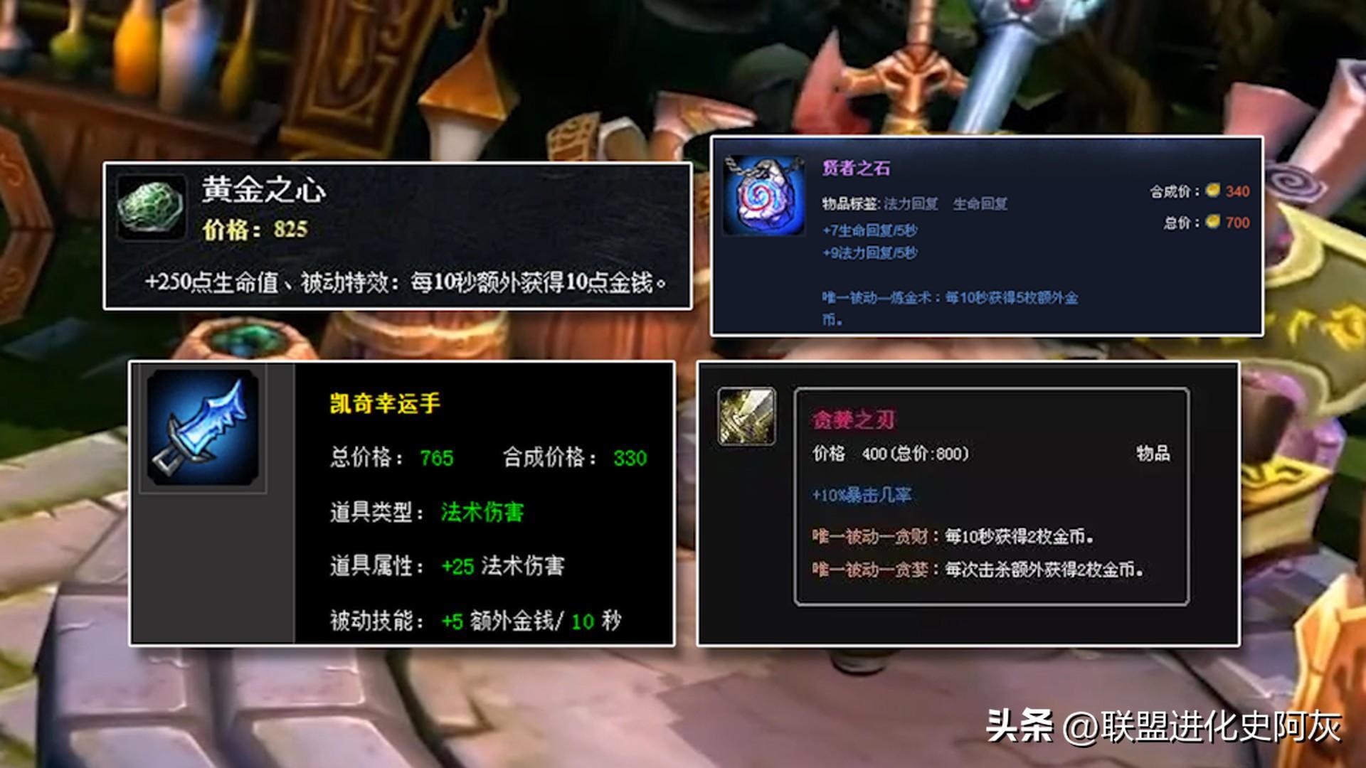 黃金之心、賢者之石、貪婪之刃、凱奇的幸運手,這四件是聯盟的初代工資裝,起初商店老闆非常良心,對它們的回購價是原價的70%,買了就穩賺不虧,被譽爲“峽谷理財神器”,恰好那會經濟來源少,打野也沒有專屬裝備,除了雙C之外,基本是人手兩三件,最經典的就是“龜賢者”,有血量有回覆,苟得發瘟!
