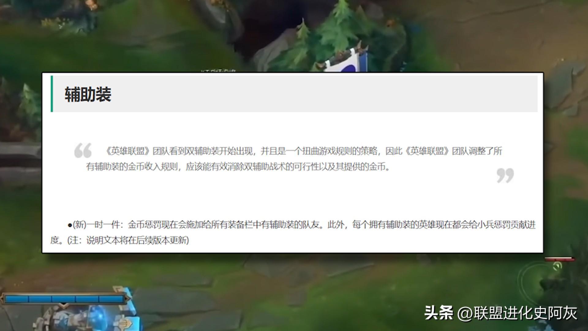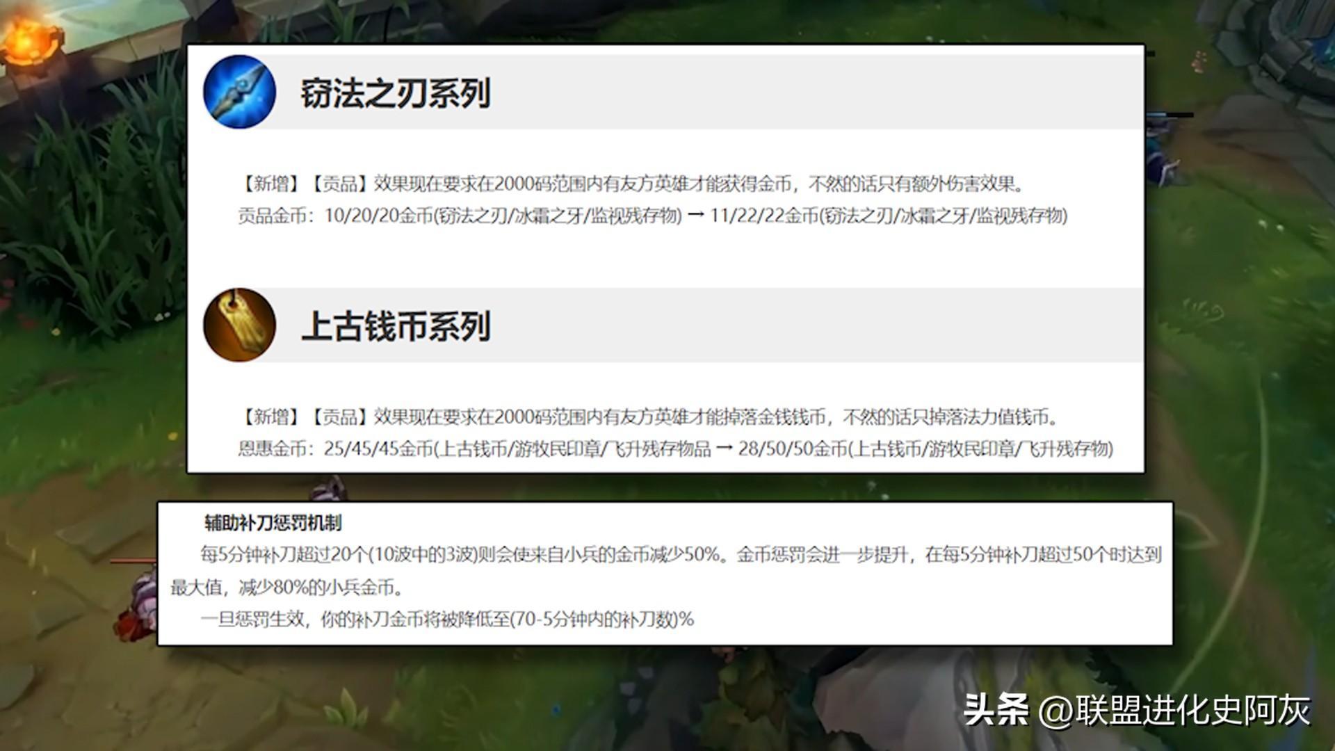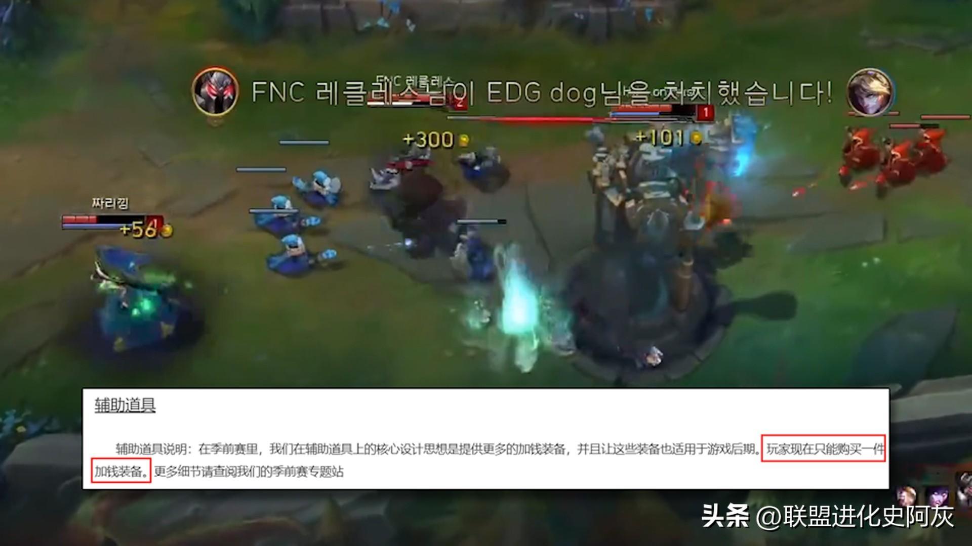 S14賽季工資裝再度改版,升級後強度巨高,很快便出現了雙工資裝,甚至四工資裝的變態套路,靠着珠子共享經濟,無視補兵懲罰超前發育,迫使設計師再添新規,所有出工資裝的英雄,金幣懲罰有難同當。