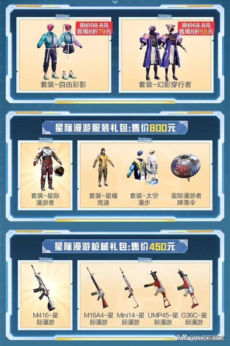 除了直售新軍需外,光子又帶來了2個全新的大禮包,一個是星際漫遊者,包括星耀競速、太空漫步以及降落傘;一個是星際漫遊槍皮禮包,分別有M416、M16A4、Mini14、Ump45、G36C。