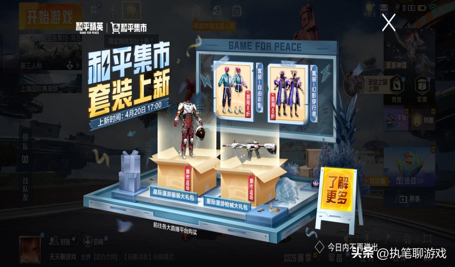 最後需要提醒一下大家,和平集市又一次上新了,這一次光子拿出了兩個新套裝,分別是自由彩影、幻影穿行者;星際漫遊系列的套裝大禮包、槍皮大禮包。