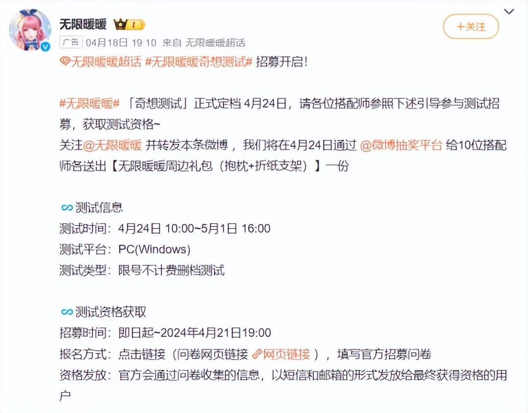 疊紙新作開放世界冒險遊戲《無限暖暖》官方宣佈「奇想測試」正式定檔4月24日,玩家可以通過參與官方互動,填寫調查問卷等方式,參與這次的限號不計費刪檔測試,開測時間爲4月24日 10:00~5月1日 16:00。