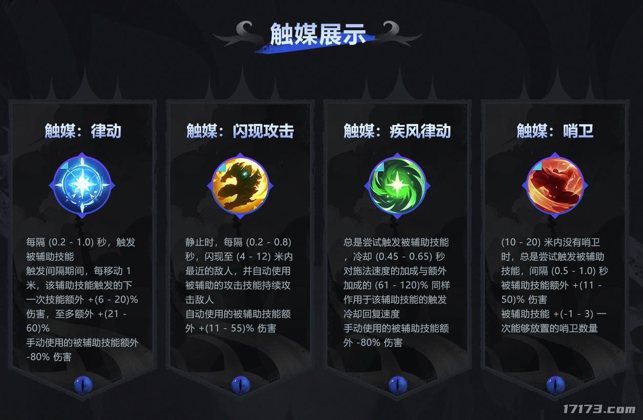 作爲本賽季的新要素之一,觸媒是一類全新的輔助技能,其效果是幫助獵人自動觸發主動技能,爲主動技能帶來額外的效果。不同的觸媒都有不同的效果和觸發條件,譬如【觸媒:律動】就會每個1秒自動觸發綁定的主動技能,並且根據移動距離提高額外傷害。