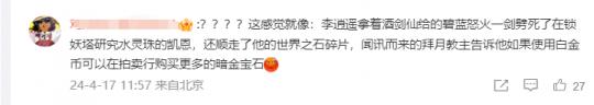 官博評論區,點贊量最高的網友表示:“感覺就像李逍遙拿着酒劍仙給的碧藍怒火一劍劈死了在鎖妖塔研究水靈珠的凱恩,還順走了他的世界之石碎片,聞訊而來的拜月教主告訴他如果使用白金幣可以在拍賣行購買更多的暗金寶石。”
