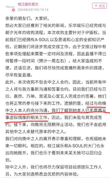 前幾天,樂華娛樂通過上市公司公告,宣佈以3000萬元從字節跳動朝夕光年手裏,收購了A-SOUL和枝江娛樂的IP版權、相關技術等。當天,“枝江娛樂官方”確認了這個消息,並同時宣佈A-SOUL成員向晚的中之人決定不簽約,“向晚”將無限期停止活動。