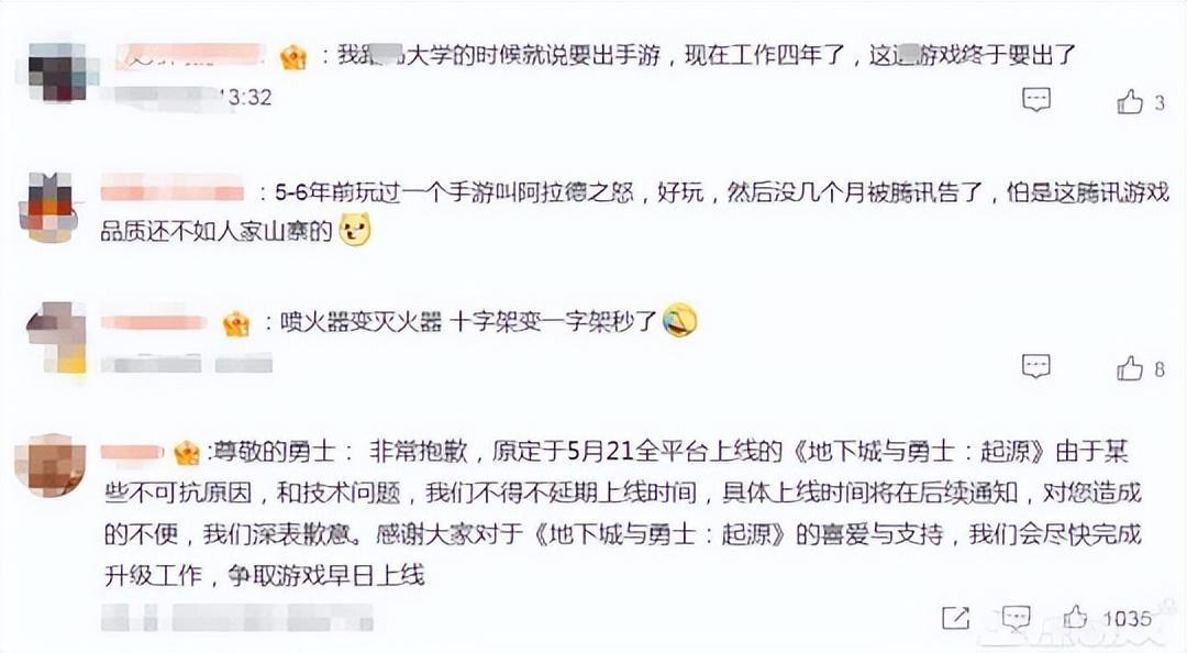 對於這次遊戲的公測,有網友就感慨,我大學的時候就說要出手遊,現在工作四年了,這嗶遊戲終於要出了。還有對遊戲品質沒信心的網友吐槽,5~6年前玩過一個手遊叫《阿拉德之怒》,然後沒幾個月被騰訊告了,怕是這騰訊遊戲品質還不如人家山寨的。