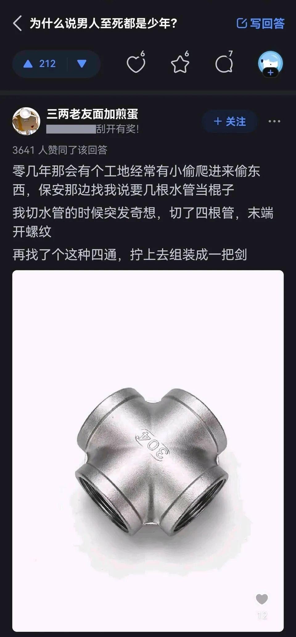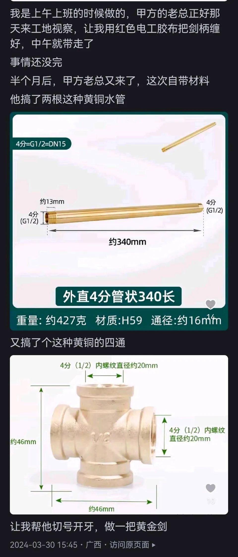 說是知乎上有個人吐槽,工地經常有小偷關顧,保安要來了幾根水管當棍子,自己卻突發奇想,用手頭有限的五金材料做了一把“大寶劍”出來。