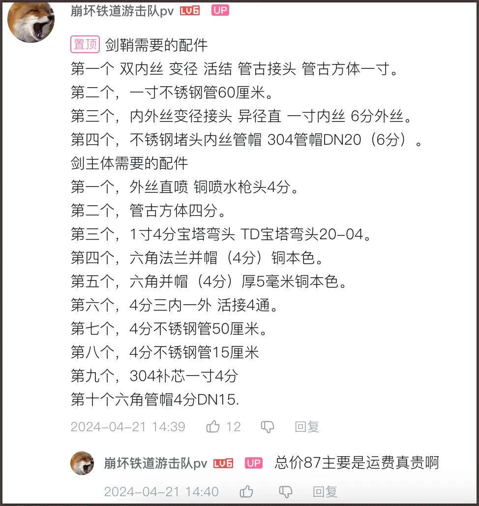 評論區有自己嘗試製作,然後公開材料表的好心大佬出來秀肌肉。甚至有大佬自己做了個劍架,看起來更帥了,引得評論區一陣感慨。