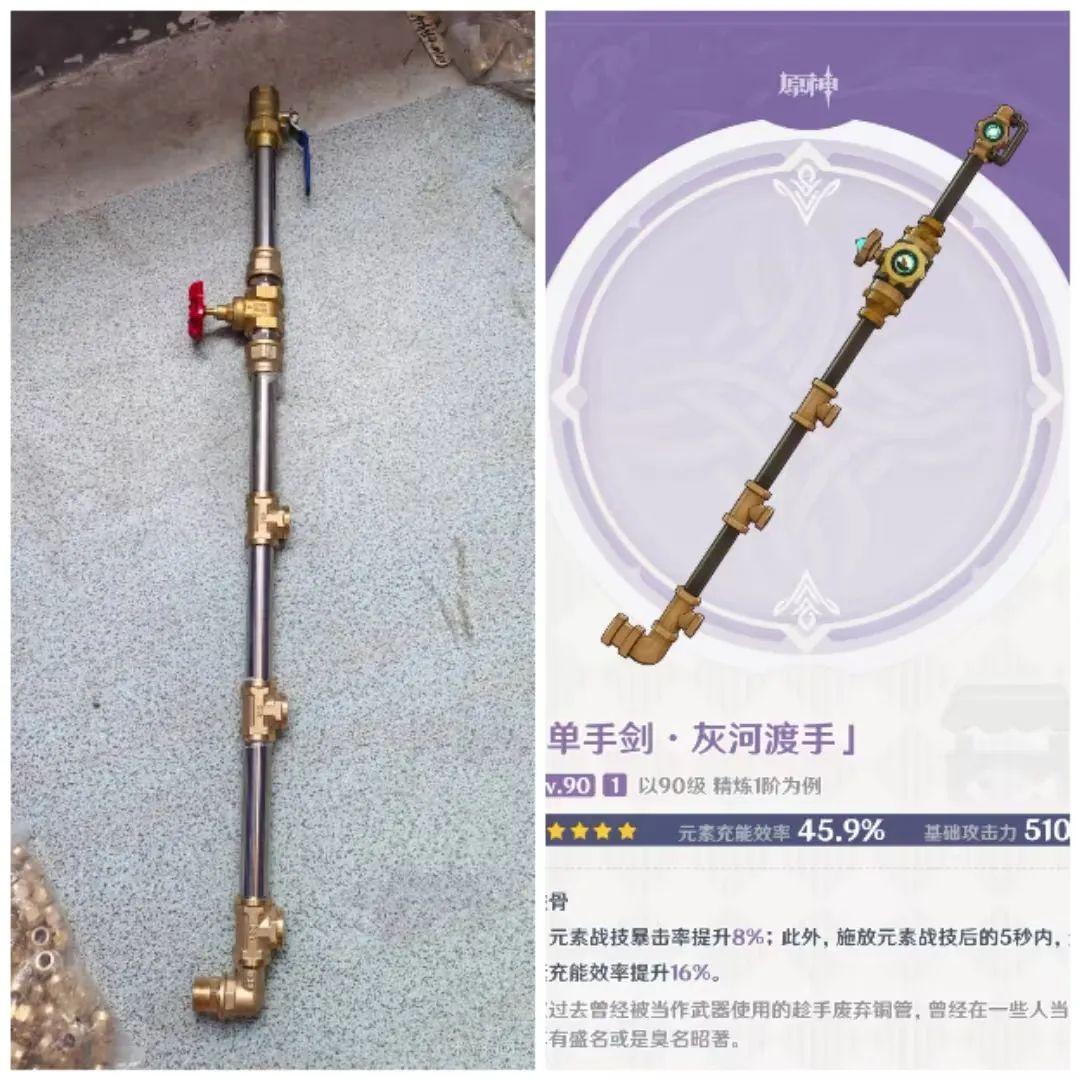 嘿,你還別說,《原神》裏真有這麼一種水管做的遊戲武器,叫“灰河渡手”。我不怎麼玩原,據說是做楓丹地區的釣魚任務兌換的。有懂的朋友可以補充。