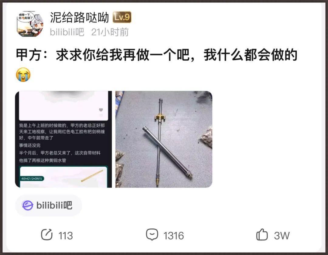 只不過沒想到土生土長的“地精科技”,最近藉着梗圖段子在社交媒體上重新翻紅了,讓五金劍又多了個別稱叫“工地聖劍”。