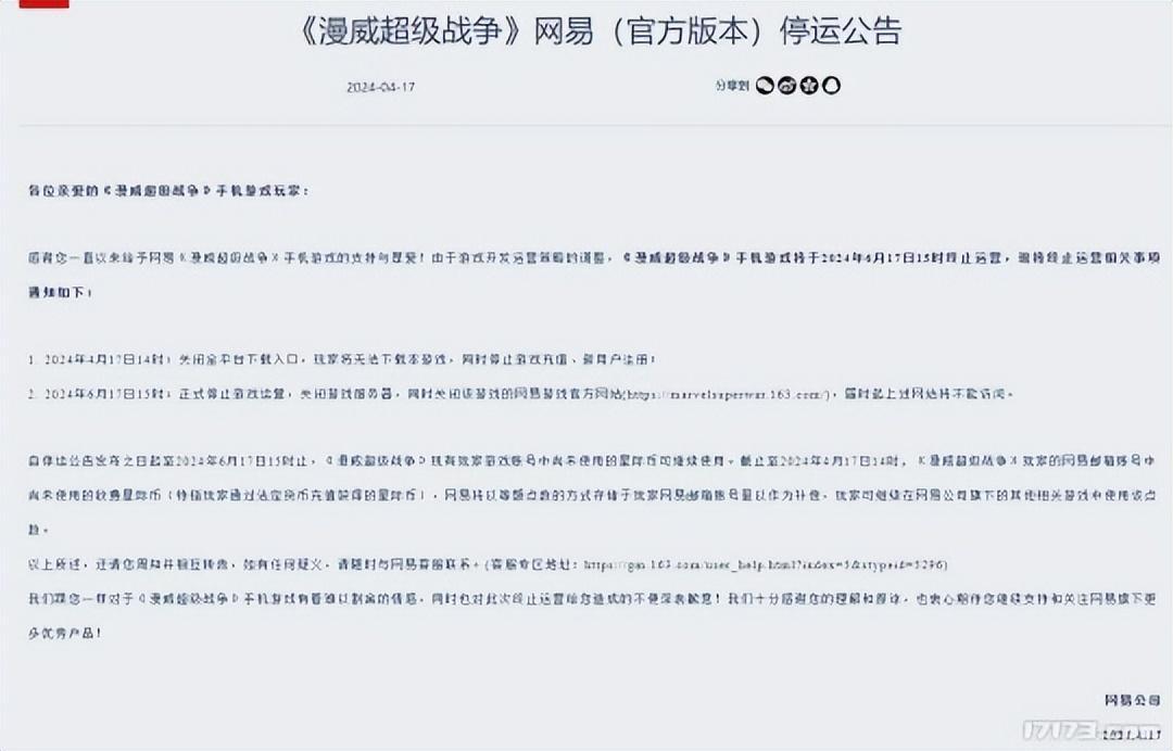 無獨有偶,同樣是6月17日,網易的另外一款遊戲《漫威超級戰爭》也將會停運。