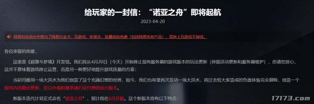 在2023年4月20日發佈了公告,宣佈開始停止現有服務器的遊戲版本的玩法更新,打算創造一個遊戲內容穩定更新、僅以外觀和賽季通行證付費的良心版本,新版本迭代計劃正式命名“諾亞之舟”,預計將在6月開服