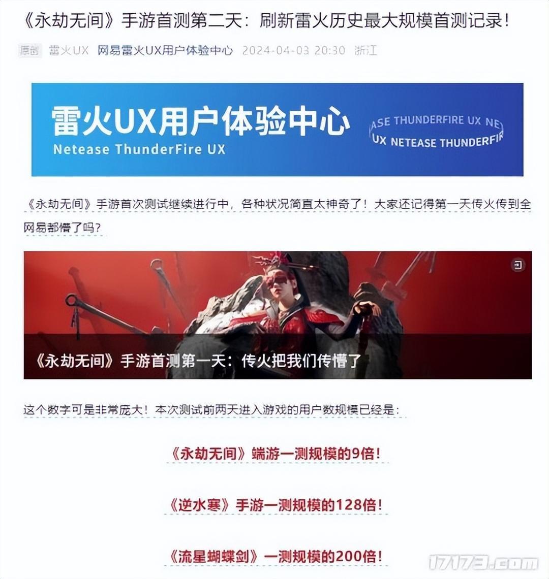 據網易雷火UX用戶體驗中心披露,光是測試前兩日湧入的玩家數量就已經達到了《永劫無間》端遊一測規模的9倍、 《逆水寒》手遊一測規模的128倍,刷新了雷火同類測試的歷史記錄。