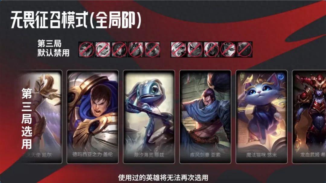 無畏徵召模式:己方隊伍在同一局BO3已完成對局中,使用過的英雄將無法再次選用。