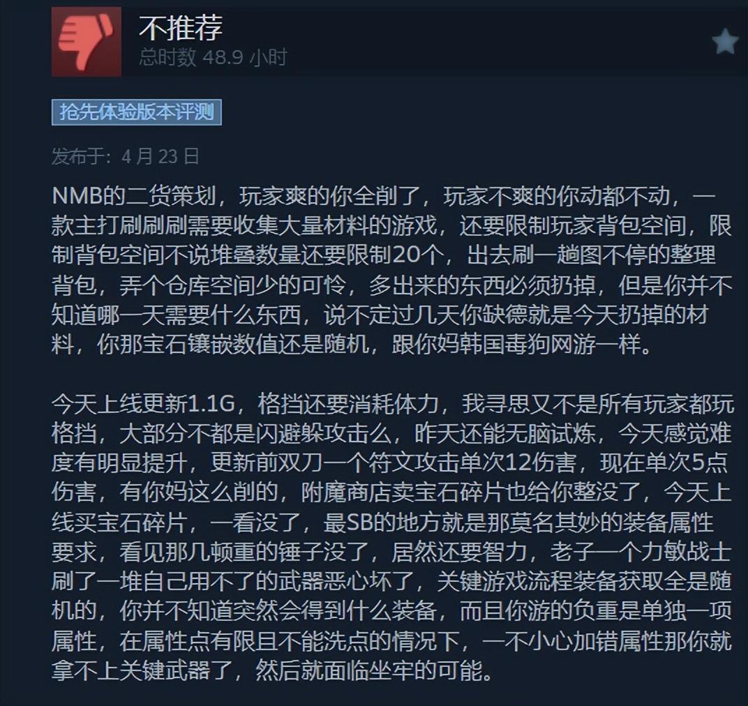 其Steam首日的好評率一度跌破60%大關不說,受這遊戲垃圾優化、反人性設計氣的UP主們更是以光速把它放進了“依託答辯”與“千萬別買”的名單中。