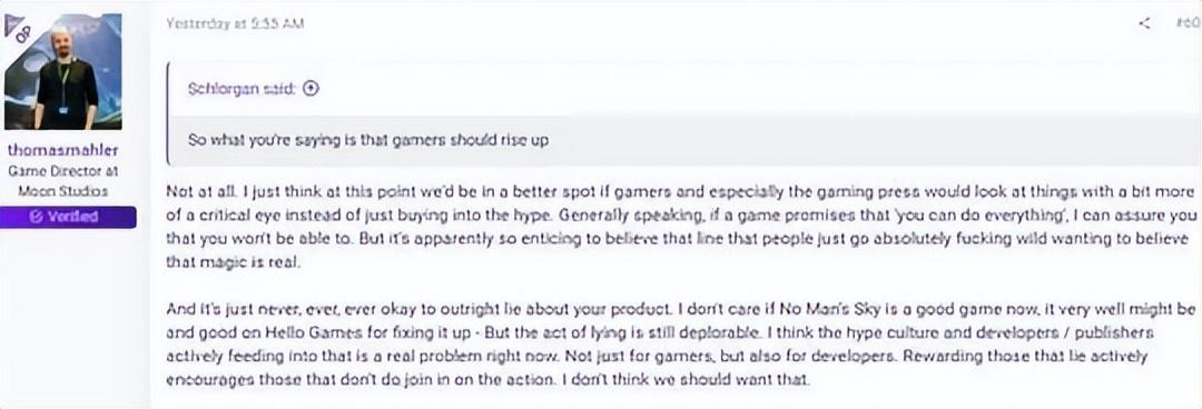 從當初的《無人深空》到後續的《賽博朋克2077》,他都第一時間站了出來,炮轟遊戲同行在宣傳上誇大其詞,在製作上偷工減料,破壞了整個行業的風氣。