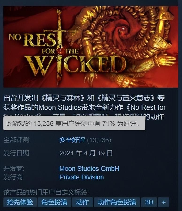 現如今,即便是Moon Studios工作室以一天一大更的敬業精神,火速修復了上百個BUG跟遊戲優化問題,這遊戲的好評率也只堪堪爬上“多半好評”的階段,距離這工作室之前的神作《奧日》系列遊戲,可差了好幾個檔次。
