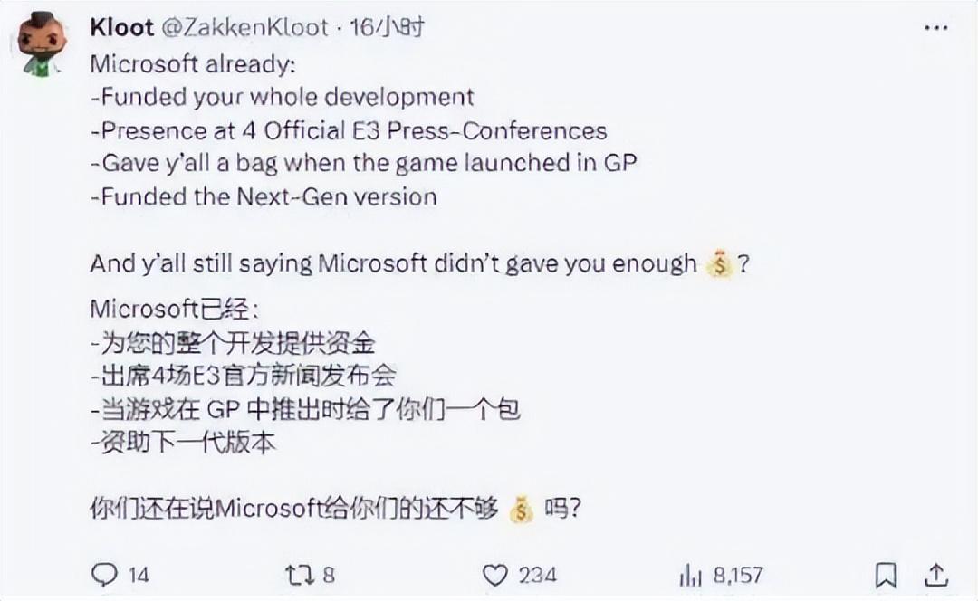 這搞得很多喫瓜羣衆都看不下去了,給Mahler好好羅列了微軟給予Moon Studios的幫助,其中包括豐厚的研發資金、4場E3展會的新聞發佈會、Xbox平臺專屬宣傳位以及資助遊戲的二代續作。