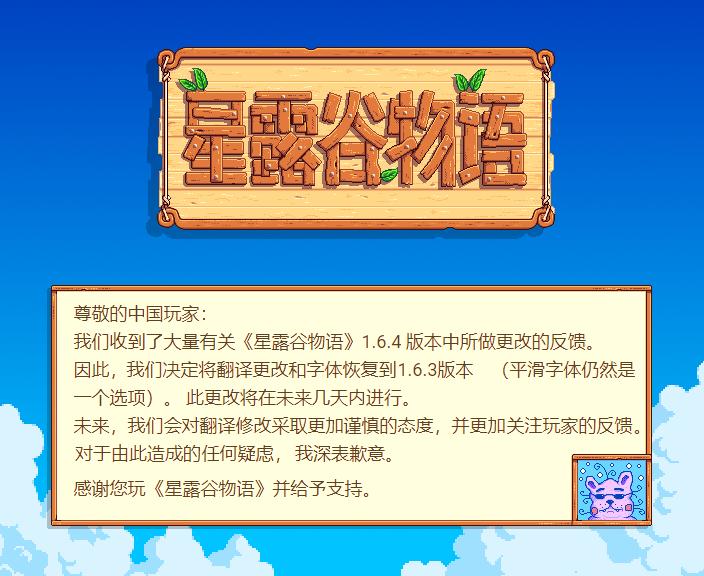 轉自星露谷貼吧,漢化組在Wiki上回復:“有關漢化的問題請到官方論壇帖子討論。修改字體是考慮到遊戲的畫面風格,玩家不習慣修改後的東西是正常現象,負面評價存在倖存者偏差(喜歡的不一定會主動發聲),不會因爲存在負面評價就撤回修改。”