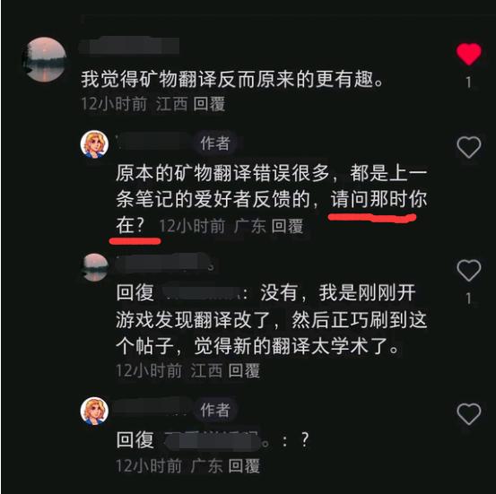 有玩家找到了此前在小紅書上收集玩家反饋的漢化組成員帳號,並在其中留言“以前的礦石翻譯更有趣”,卻被漢化組成員嘲諷了。