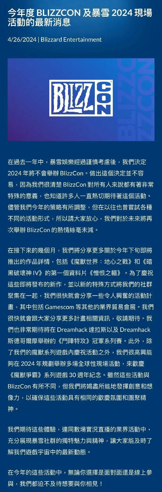 2024年暴雪嘉年華宣告取消