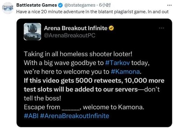 《逃離塔科夫》的開發商Battlestate Games則直接發文硬鋼,諷刺稱“在這個徹頭徹尾的抄襲遊戲中,度過愉快的20分鐘冒險。進入遊戲,退出遊戲。”