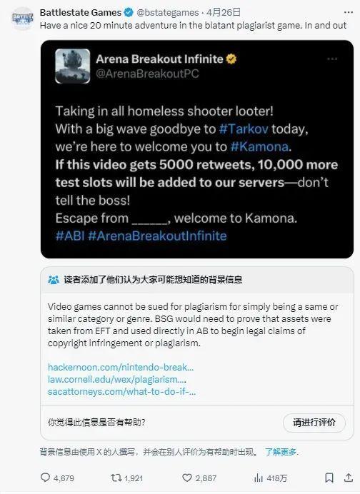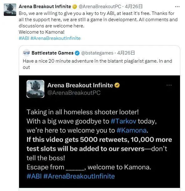 不過,看到這則消息,尼基塔終於坐不住了。他們開始尋求反擊,很快就轉發了《暗區突圍》端遊海外版的推文,並表示「這是一款公然抄襲的遊戲,只配給它20分鐘。」