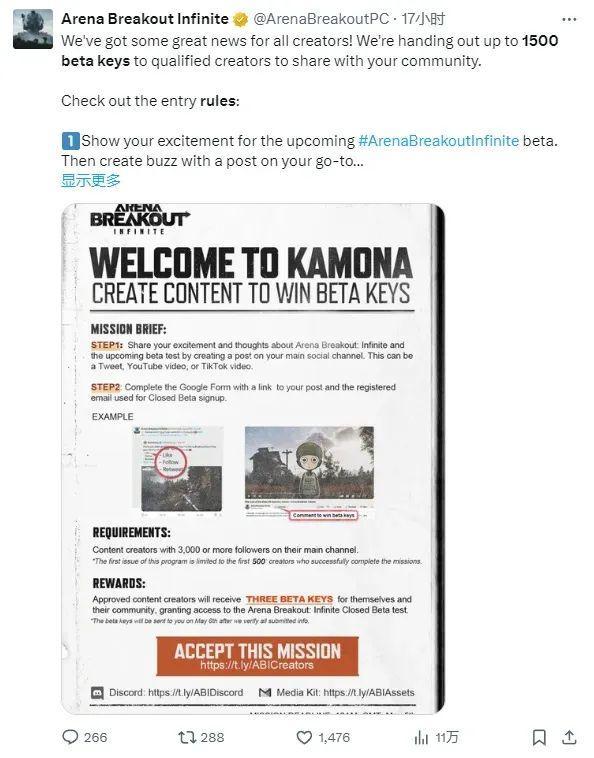 而且,《暗區突圍》端遊海外版也是一點也沒閒着,在熱度最高時,除了歡迎塔科夫普通玩家以外,官方也發佈了海外創作者招募的信息,表示向內容創作者敞開大門。