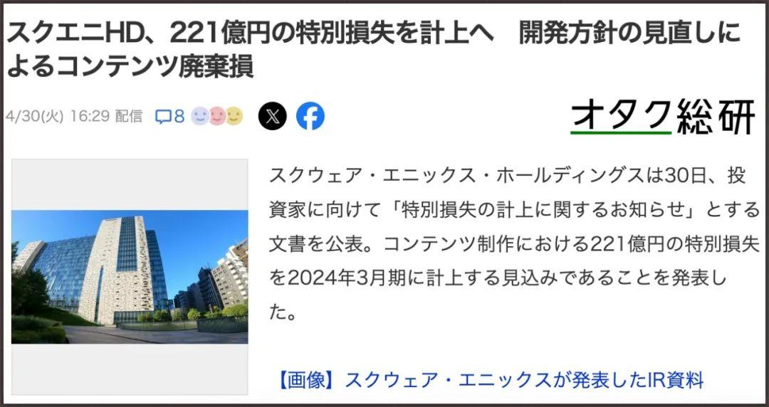 經過對開發中項目的評估,預計公司將在2024財年因“內容製作廢棄”而面臨約221億日元的特別損失。