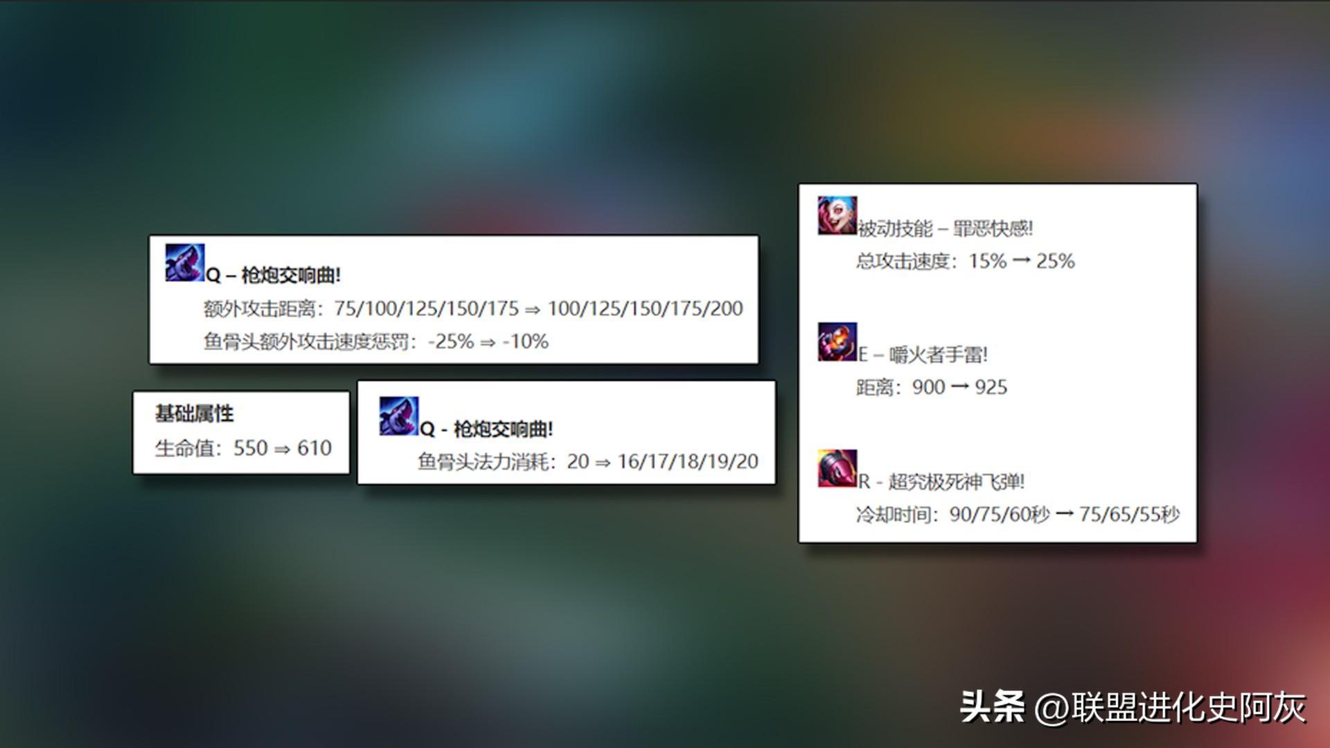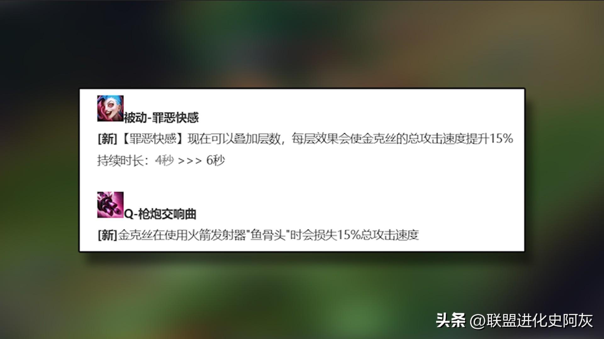 5.22版本ADC大改,新版被動能疊攻速,但作爲代價,炮形態下自帶減攻速debuff,注意!是“總”攻速,至少得兩層被動才比原來厲害,大爽幾秒鐘和小爽一整場,哪個更賺不用我說吧?特別是前期一切炮感覺手上跟特麼掛了磚頭似的,相當不得勁。在這之後金克絲玩法大變,原本一把電刀或者紅叉,攻速就夠用了,改版後得先出火炮颶風,三件套才能發力(黃叉系沒攻擊力)。