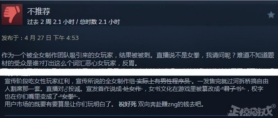 如今遊戲在steam上的口碑“多半差評”,好評率只有39%,遊戲的質量還可以,但是遊戲內容讓一些“極端女拳”玩家覺得不夠“女拳”因此刷差評。