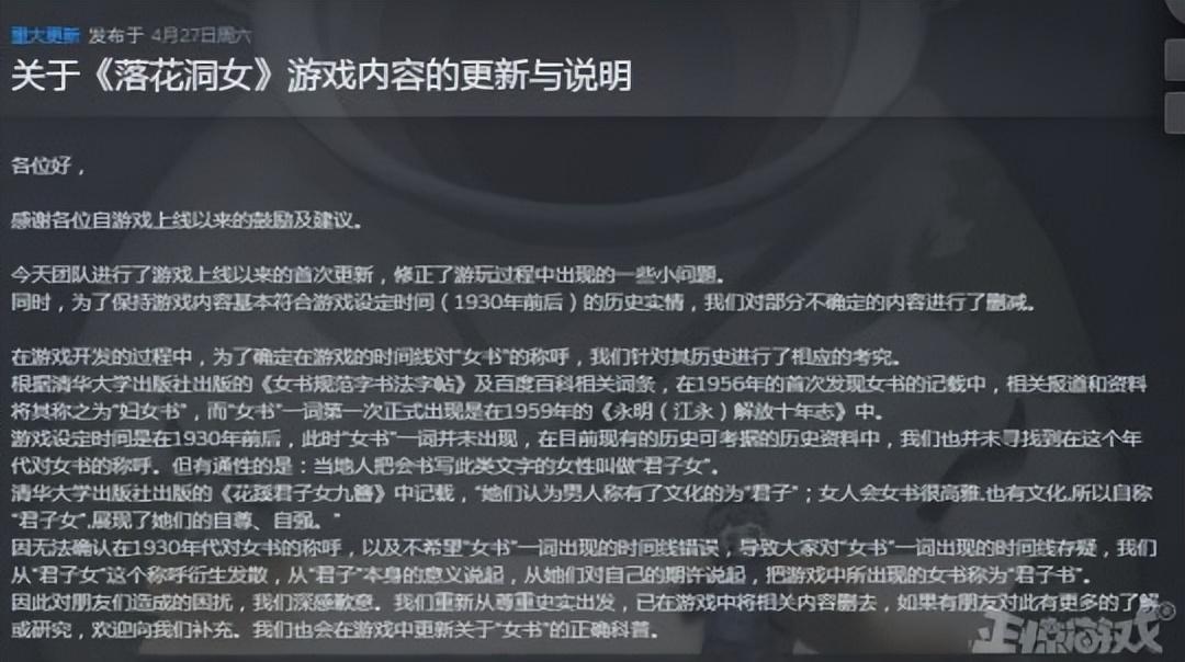 雖然這點後來官方進行了解釋,“女書”是後來纔出現的專有名詞,遊戲所在的時代還沒有這名詞, “君子書”根據相關資料工作室杜撰的,目前已刪除這部有爭議的內容。但已經被因此吸引而來的各位女玩家瘋狂衝了一波。