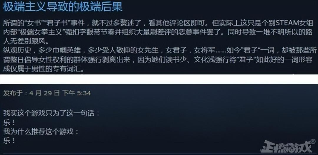 不過也有好評玩家表示,遊戲不錯,但是被極端女拳扣字眼惡意刷差評了。還有喫瓜的好評玩家表示,買這遊戲只爲了樂,推薦這遊戲也是爲了樂。