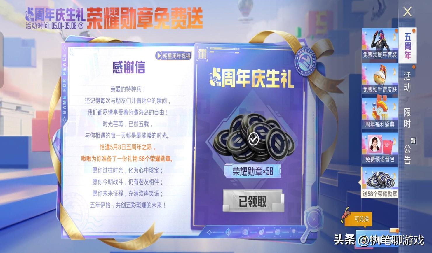 如果錯過第1次的話,那麼就要等待第2次機會,時間是5.8,也是《和平精英》正兒八經的週年紀念日。但凡當天進入遊戲的玩家,同樣可以獲得58個榮耀勳章。