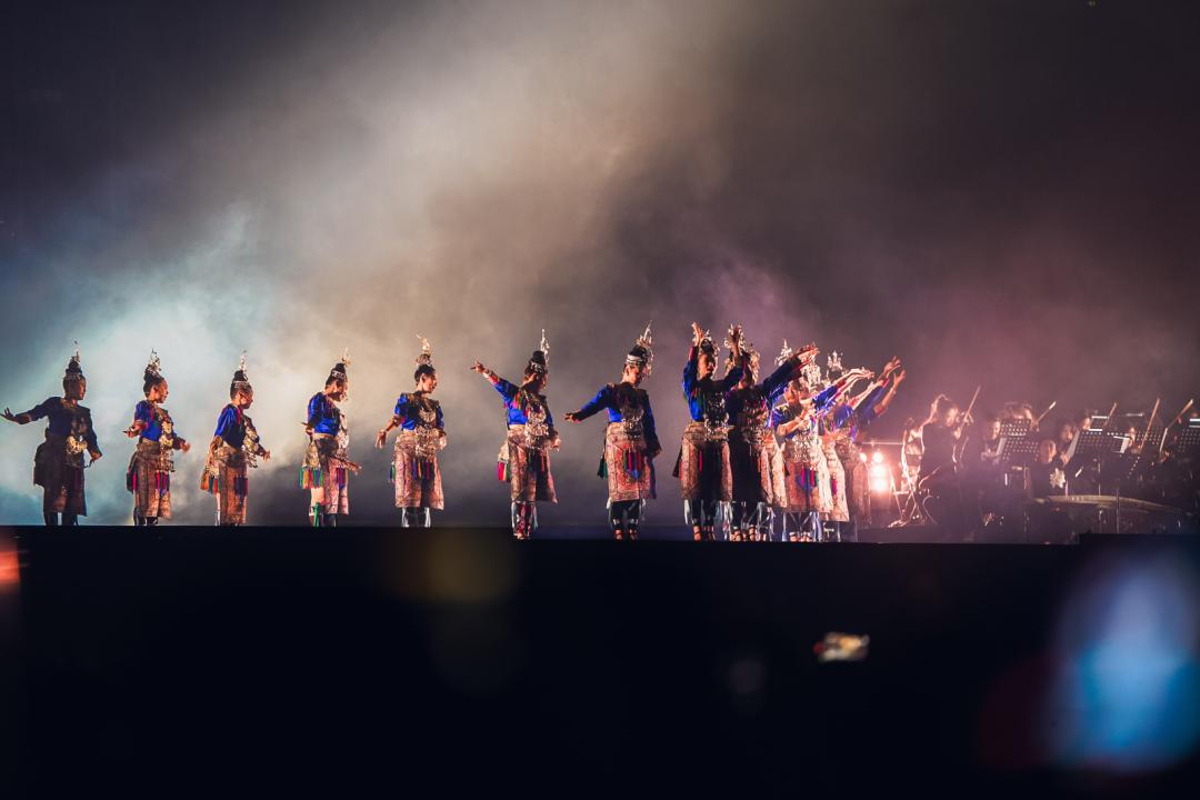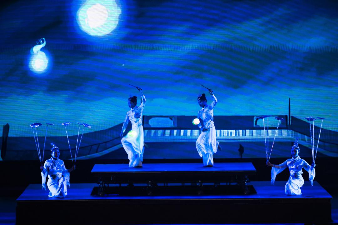 在演奏《天下熙熙》《邀挽明月成宵宴》時,舞臺用長袖舞表演,演繹了仙舟街市熙攘、科技宮闕的街景;
