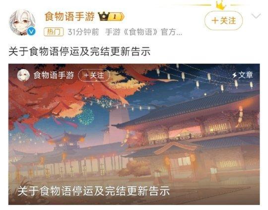 4月,《食物語》官方發佈公告稱,由於代理協議到期,遊戲將在2024年6月18日正式停止國服的運營。