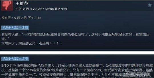 不過也有對本作不滿的玩家表示,一代的指向鼠標所屬位置的選項沒有了,這對於純鍵盤玩家很不友好。還有玩家發現《哈迪斯2》也搞政治正確,新加入的角色幾乎都是黑人,月光女神也是黑人,此外還有武器平衡差,鼠鍵配設不行等問題。