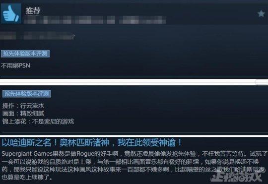 有調侃索尼的《絕地潛兵2》強行綁定操作的好評玩家表示,不用綁定PSN。還有玩家表示,操作:行雲流水。畫面:精緻細膩。錦上添花:不是索尼的遊戲。還有玩家表示,這樣畫風的故事來一百部都不嫌多,比起隔壁的《絲之歌》來哈迪斯玩家是喫上細糠了。