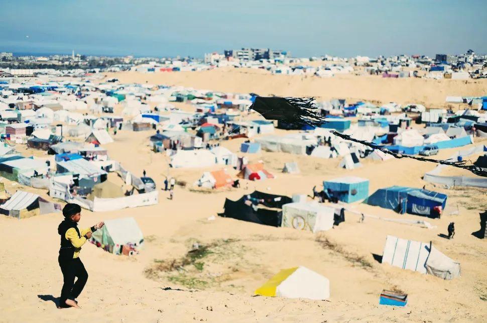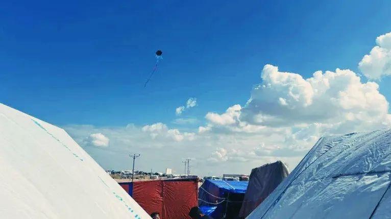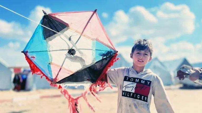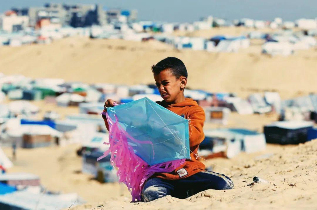 同樣是此時此刻,加沙與以色列的衝突,導致拉法有百萬難民滯留在臨時帳篷組成的避難區。避難區中,每天都有小孩用廢紙做成風箏,這裏沒有踢足球的空間和奔跑的麥田,所以放風箏是他們唯一還能進行的娛樂。