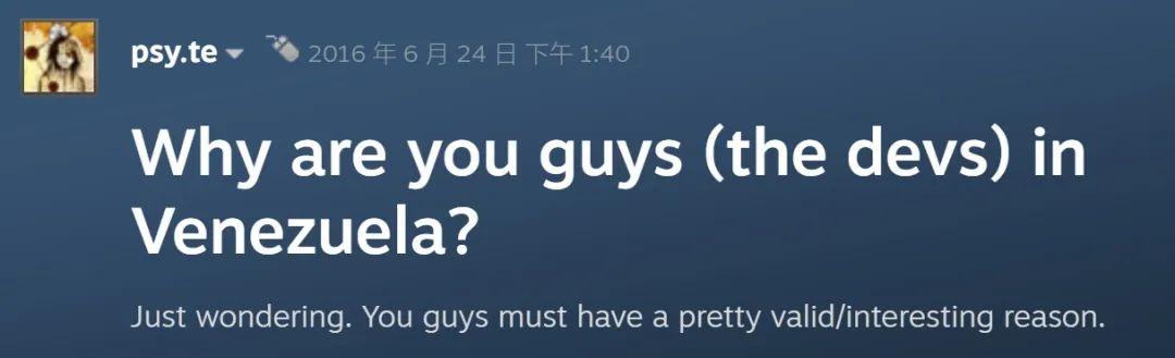 遊戲發售時,曾有日本玩家在Steam社區提問:爲什麼製作組要在委內瑞拉生活?這問題遭到了嘲笑,有人指出,不是所有人都能選擇自己的出生地,也不是所有人都有能力逃離與生俱來的苦難。