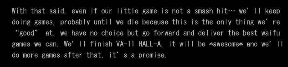 製作組說,假如能賺到足夠多的錢,他們就會逃離這裏。要是遊戲沒有成功,他們就會繼續嘗試,做出新的遊戲,直到死亡爲止。因爲在這裏,這是他們唯一擅長的事。