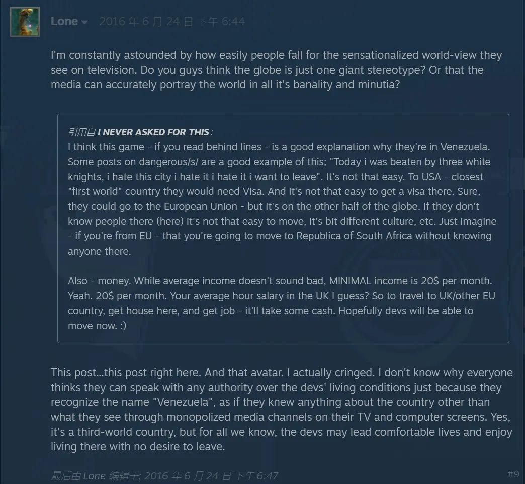 但同時,亦有歐洲的玩家嘲諷道:他不屑於貼子裏的各種回答,因爲他相信他們都被洗腦了,只能看到媒體報道的“第三世界國家”刻板印象。其實大家根本不瞭解委內瑞拉的真實狀況,沒準製作人過得很好,很享受日常生活,沒有離開的想法。