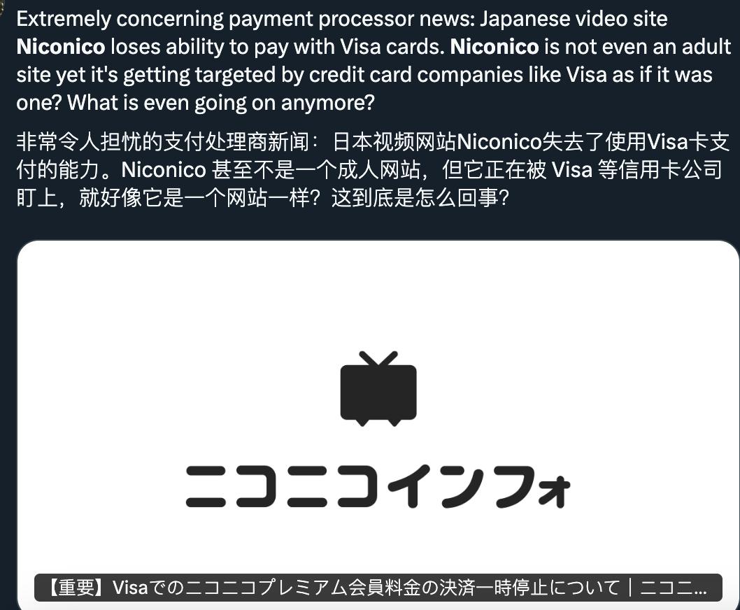 NicoNico動畫發佈公告:“由於種種原因,網站的付費會員費從5月10日開始暫停部分Visa信用卡支付功能,並從5月下旬起將全面暫停Visa信用卡支付。”