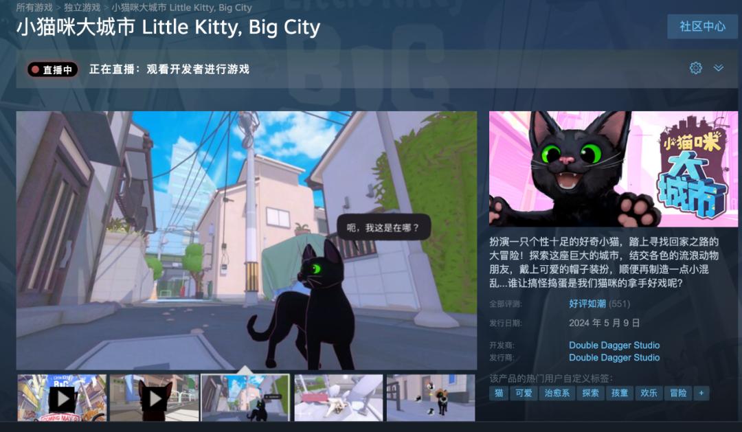 由開發商Double Dagger Studio打造的休閒冒險獨立模擬遊戲《小貓咪大城市》已於北京時間5月10日00:00正式發售,登陸Steam、Switch和 XBOX平臺,遊戲售價66元,目前享受10%的首發折扣。