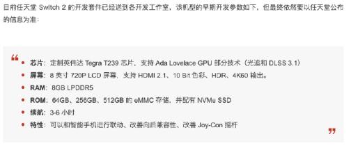 消息一經公佈,NS2代的後續動向和具體參數也都相繼爆出,據爆料者稱世嘉、Atlus的重製版遊戲都會登錄NS2,同時NS2還會兼容老機型卡帶。