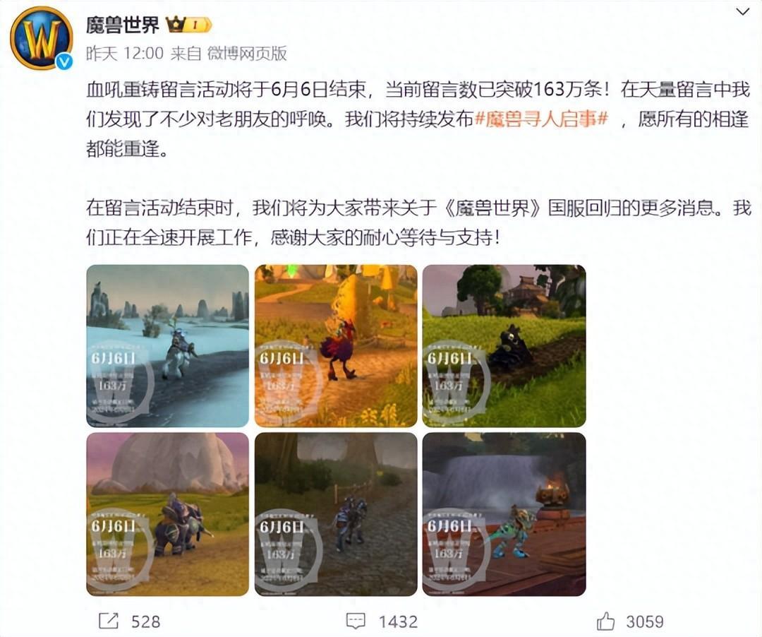 5月10日,《魔獸世界》官方再度發聲,貼心提醒各位玩家血吼重鑄留言活動將於6月6日結束,當前留言數已突破163萬條!